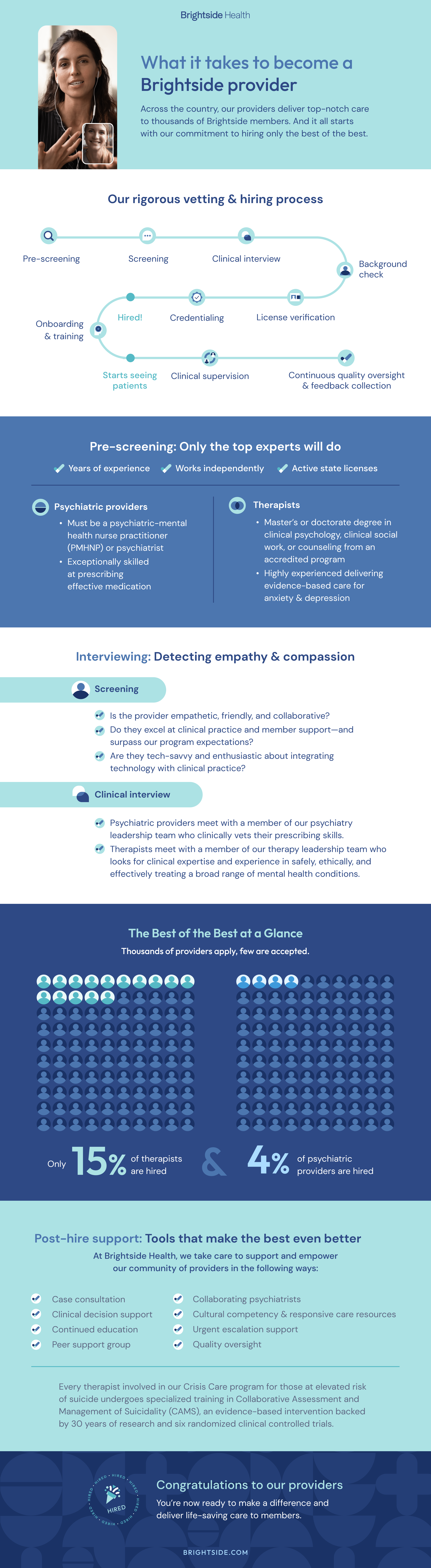 At Brightside Health, our providers are handpicked for their ability to provide best-in-class mental health care. To ensure the highest quality of care, every provider in our network undergoes a rigorous hiring and vetting process. From there, we support and empower them with tools and technology—all so they can deliver life-changing care to our members. Here’s a look at what it takes to become a Brightside provider.